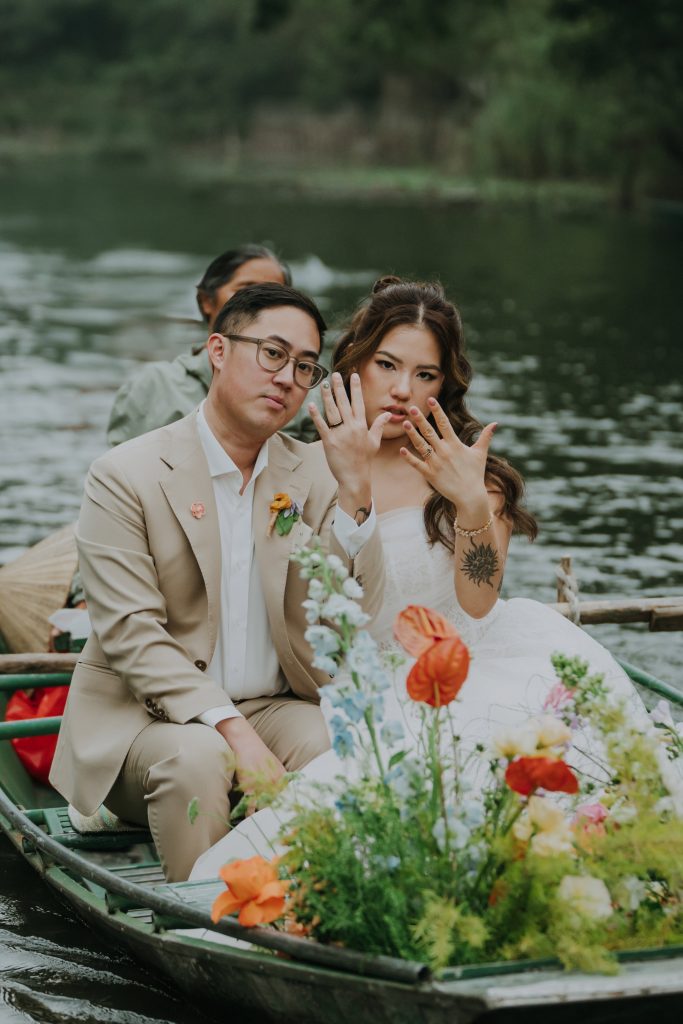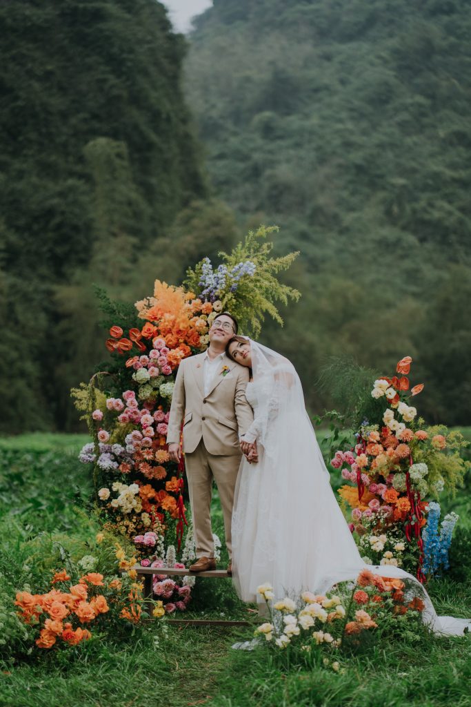 To celebrate their union, Catherine and Johnny chose to host a destination wedding in Ninh Bình, a region in northern Vietnam known for its breathtaking landscapes—towering limestone cliffs, winding rivers, and endless stretches of greenery. It was the perfect backdrop for a love story as colorful and unique as theirs. The couple envisioned a wedding that wasn’t just a ceremony, but an experience—bursting with color, energy, and personality. We brought this vision to life by infusing every detail with joyful vibrance. From the bright floral decorations to the guest dress code, every guest became a part of the celebration’s living, breathing color palette. Everyone was like a blooming flower, coming together to create a radiant garden of love.