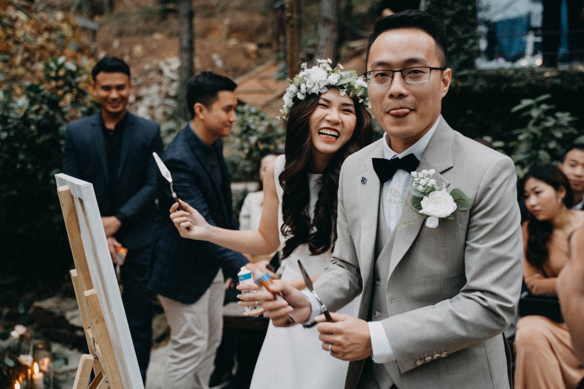 Hoặc cũng có thể mời những khách mời thân thiết cùng nhau vẽ nên bức tranh của hai bạn. Mỗi biểu tượng hay nét vẽ của họ có thể thay cho lời chúc phúc gửi gắm đến cặp đôi. Sau lễ cưới, giống như các nghi lễ khác, bạn sẽ có một vật kỷ niệm đáng yêu để mang về nhà.