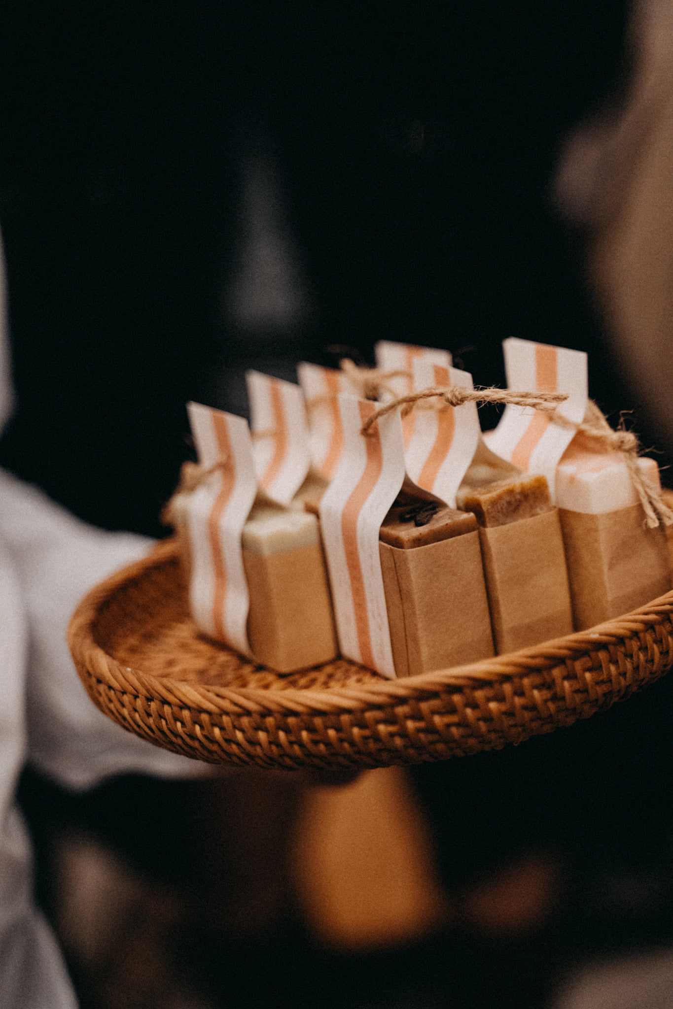 Xà phòng handmade với hương thơm tự nhiên, dễ chịu, nguyên liệu lành tính, cũng là món quà tinh tế cho khách mời đám cưới. Bạn còn có thể sáng tạo thêm bằng cách đóng dấu, in tên hoặc ký hiệu đặc biệt nào đó để khách mời thêm ấn tượng.